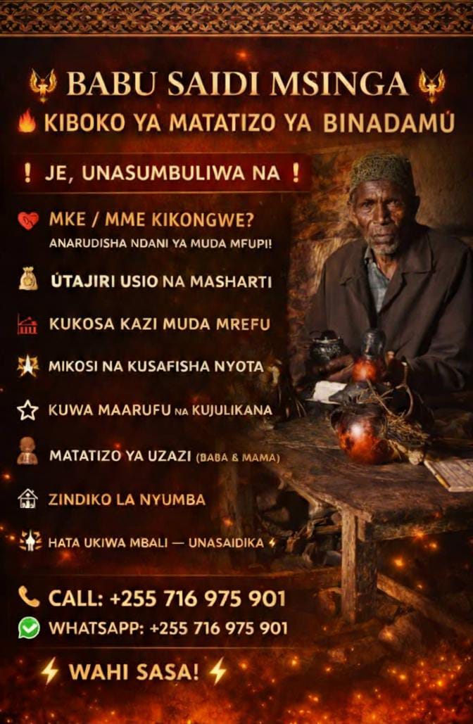 Karibu katika kituo rasmi cha Babu Saidi Msinga, mtaalamu maarufu wa tiba asilia mwenye uzoefu wa miaka mingi katika kutatua changamoto zinazowasumbua watu wa rika zote. Hutumia tiba za asili, baraka za jadi, na utaalamu wa kizazi kwa kizazi kukupa faraja na mafanikio ya kweli katika maisha.